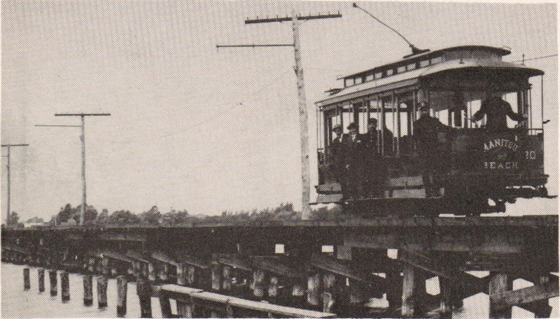 A view of Manitou Beach as seen from the trolley. Street car tracks are featured, and the Manitou Hotel is in the center. |
