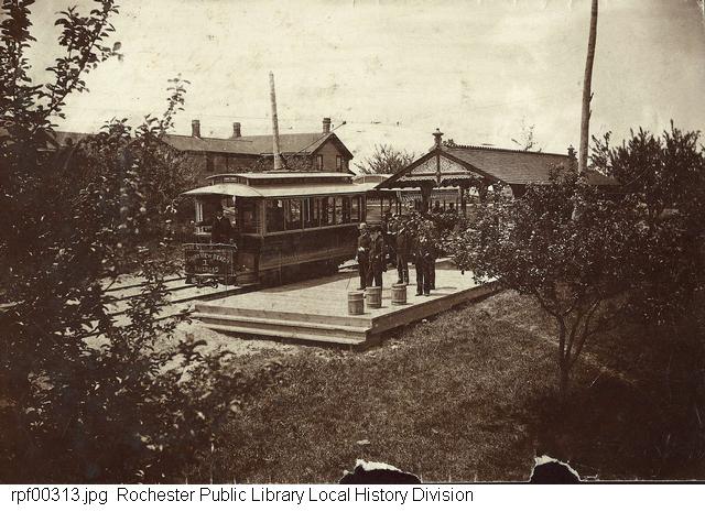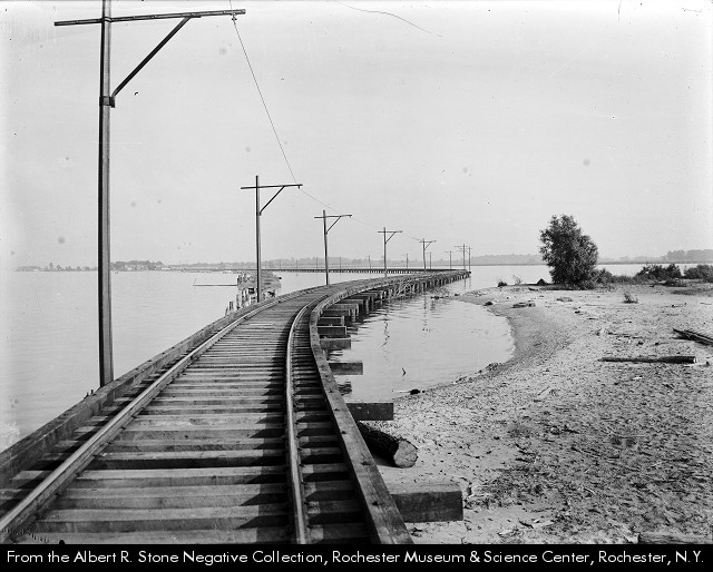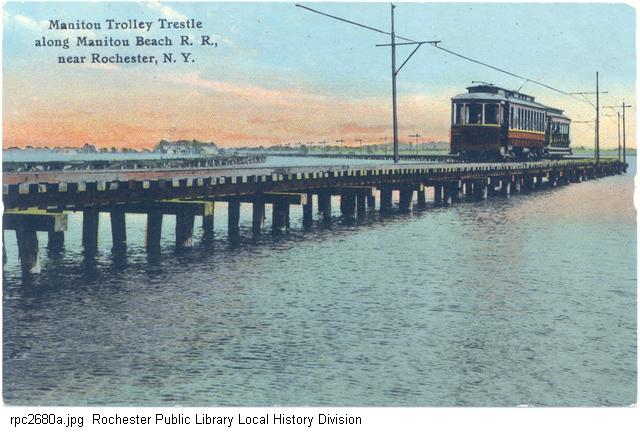 In the early 1900s, the Manitou Trolley carried summer vacationers to the many resort hotels contained within eight scenic miles along the shore of Lake Ontario. It only cost a nickel to go from Charlotte to Manitou Beach, crossing Braddocks Bay on a wooden trestle. |