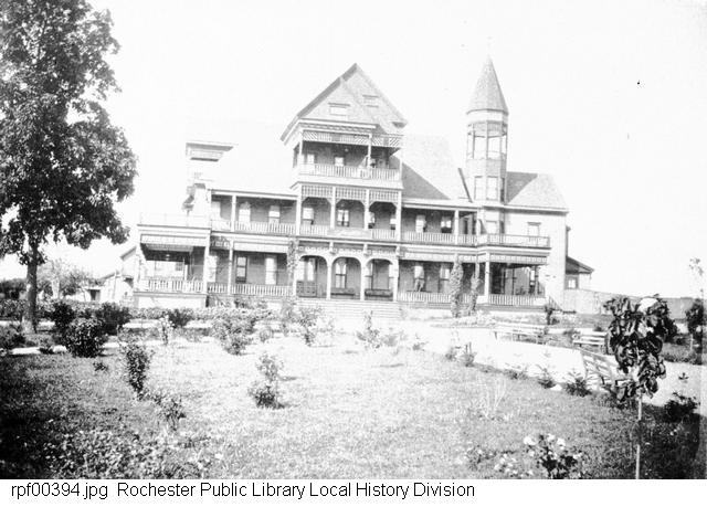 | The Manitou Hotel at Manitou Beach, which opened in 1889, and still operated as the Manitou Beach Hotel in the 1950s. The trolley line brought visitors from Charlotte to Manitou. This view shows the building and grounds. |