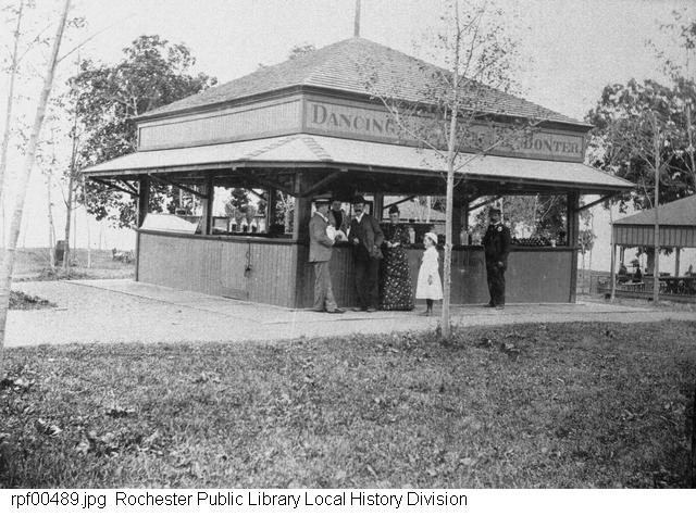 | Dance hall at Manitou Beach. People are standing on the second floor balcony of the dance hall building at Manitou Beach. The lettering on the roof reads Manitou Lunchroom. The first floor of the building was used as a bar, while the dance hall was on the second floor.