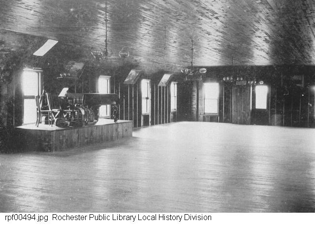An interior view of the dance hall building near the Manitou Hotel at Manitou Beach, showing the stage and dance floor.![]() |
