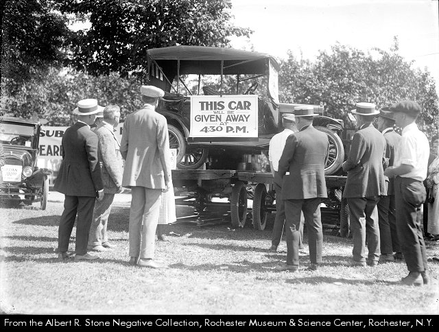 | Rochester "flivver" owners celebrate Ford Day at a picnic at Manitou Beach. A group admires a Ford automobile which was to be given away at 4:30 p.m. that afternoon. The automobile is up on a platform made from two carts parked next to each other. Printed in Rochester Herald, July 30, 1922. |
