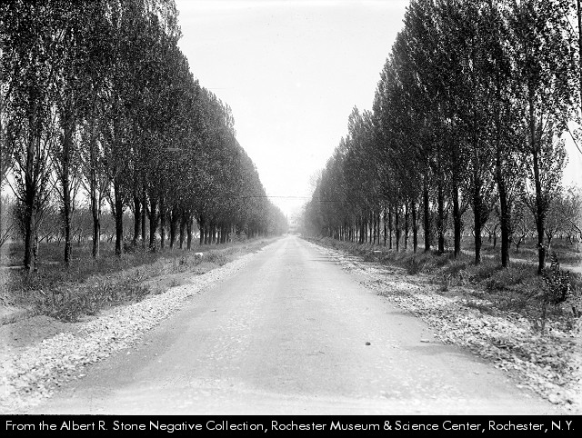 | Poplar tree-lined Manitou Beach Road leads to the Odenbach Hotel, barely visible in the background, on Manitou Beach. | ![]() |